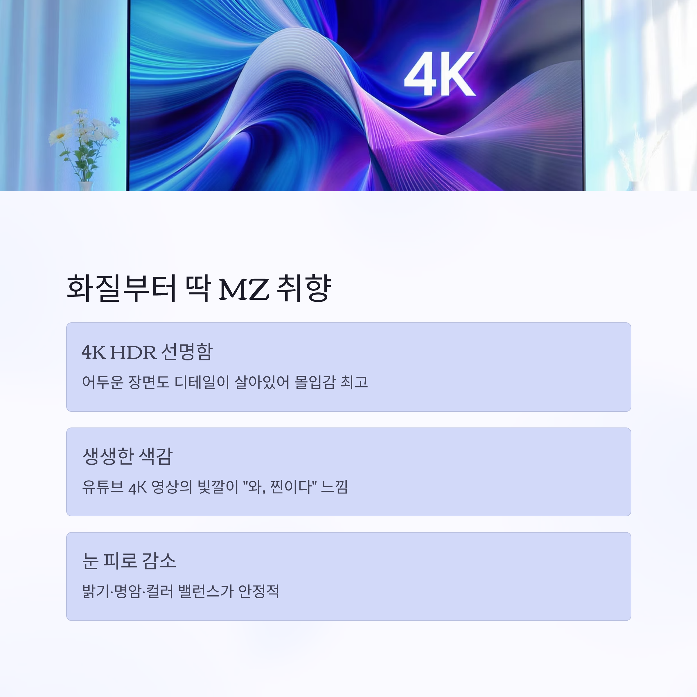 4K HDR이 주는 선명함이 진짜 달라요. 넷플릭스 오리지널 시리즈 보는데 어두운 장면도 디테일이 살아 있어서 몰입감이 엄청났습니다. 유튜브 4K 영상도 빛깔이 선명하고, 색감이 뭔가 "와, 찐이다" 싶은 느낌이었어요.