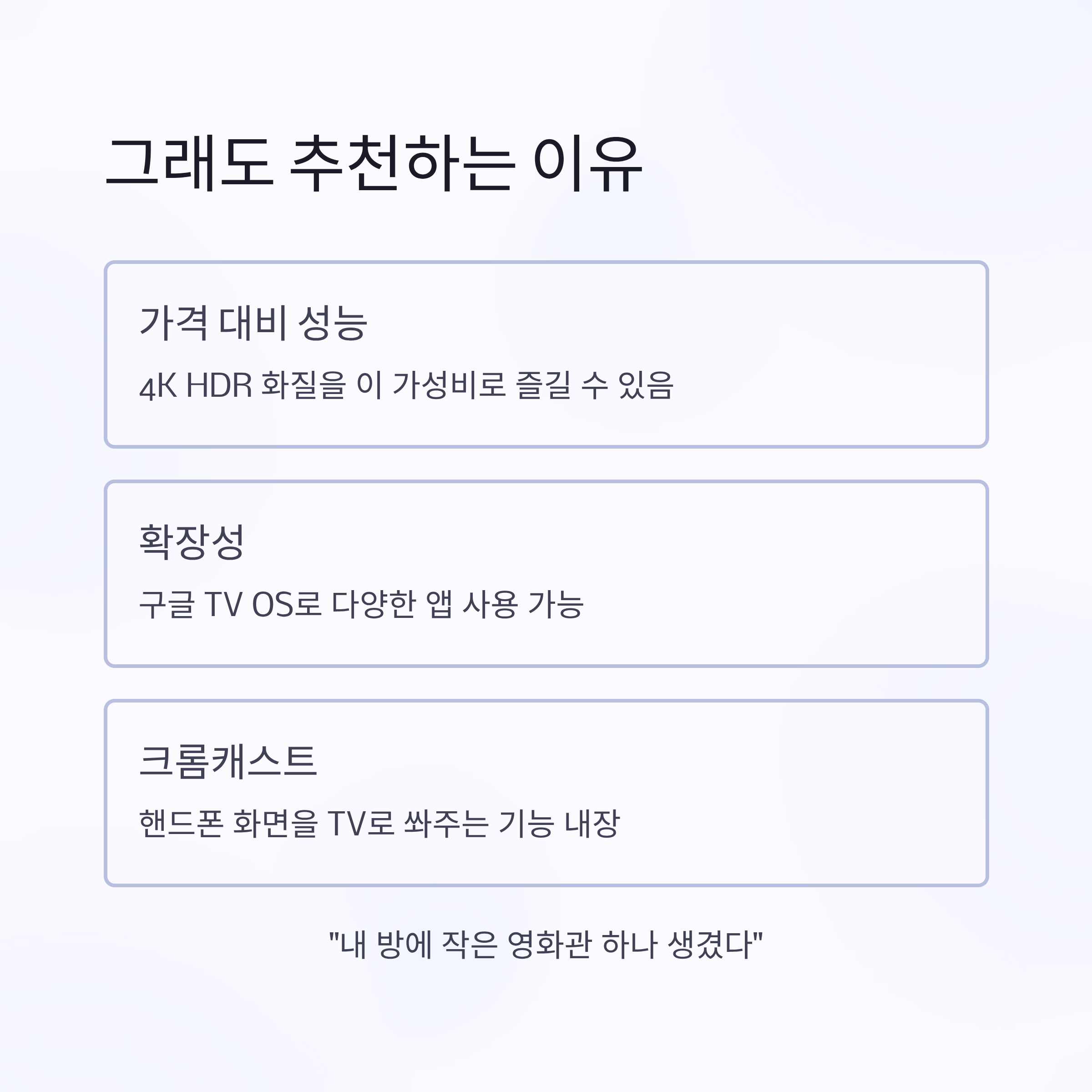 솔직히 가격 대비 성능이 너무 좋아요. 넷플릭스, 유튜브, 디즈니+ 같은 OTT를 즐기면서 4K HDR 화질을 이 정도 가성비로 즐길 수 있다는 게 가장 큰 장점이에요.