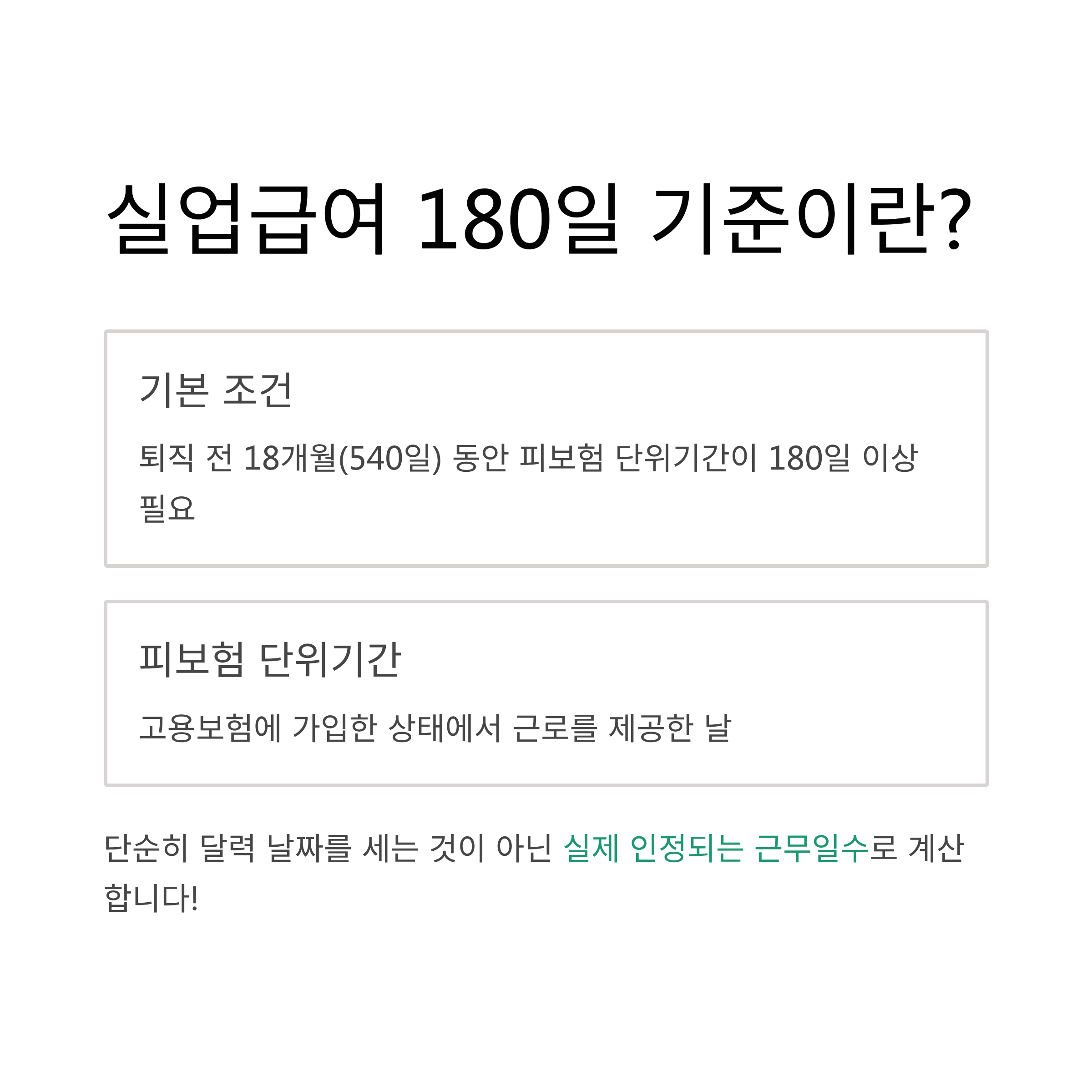 실업급여 수급 조건 중 가장 핵심이 되는 것이 ‘피보험 단위기간 180일’입니다.