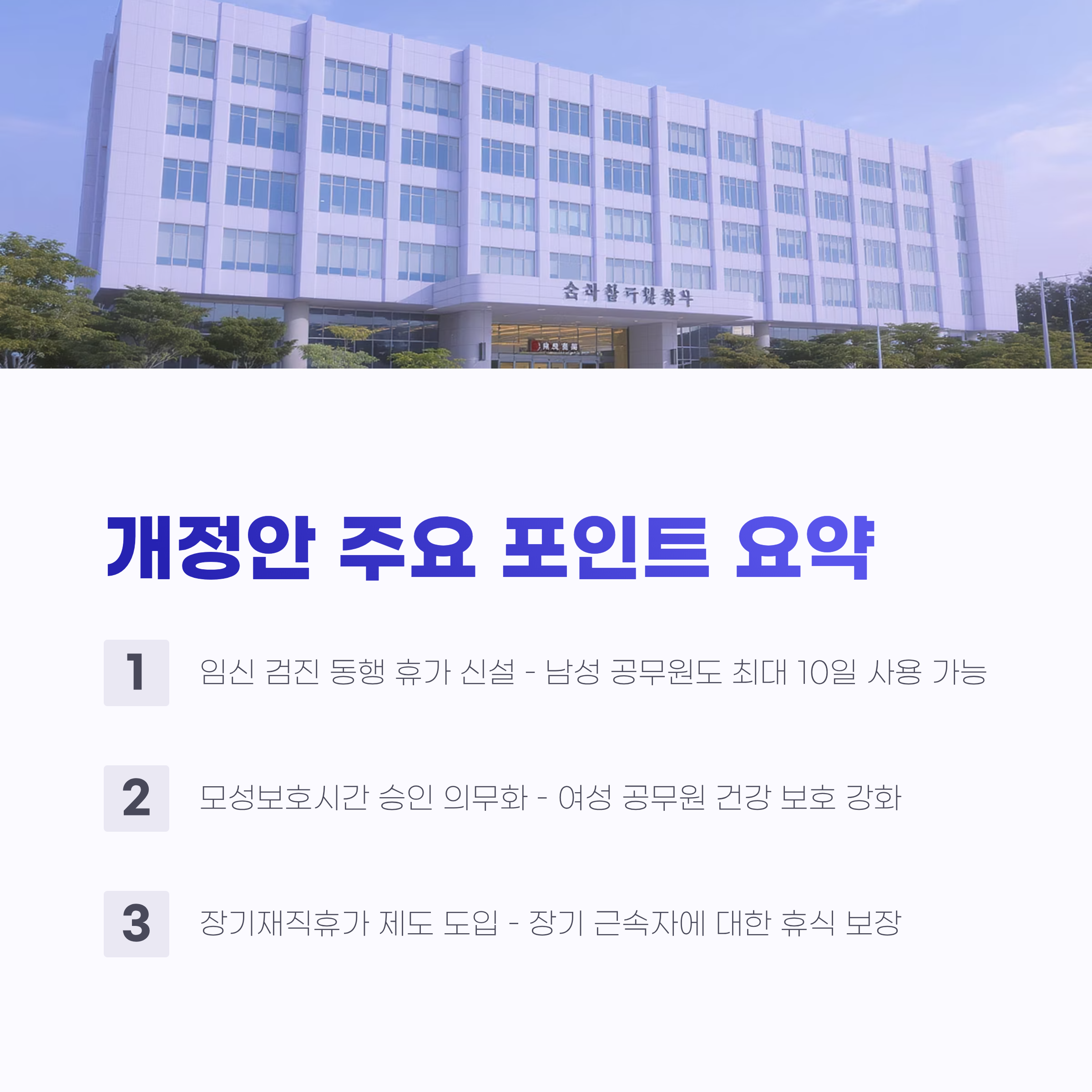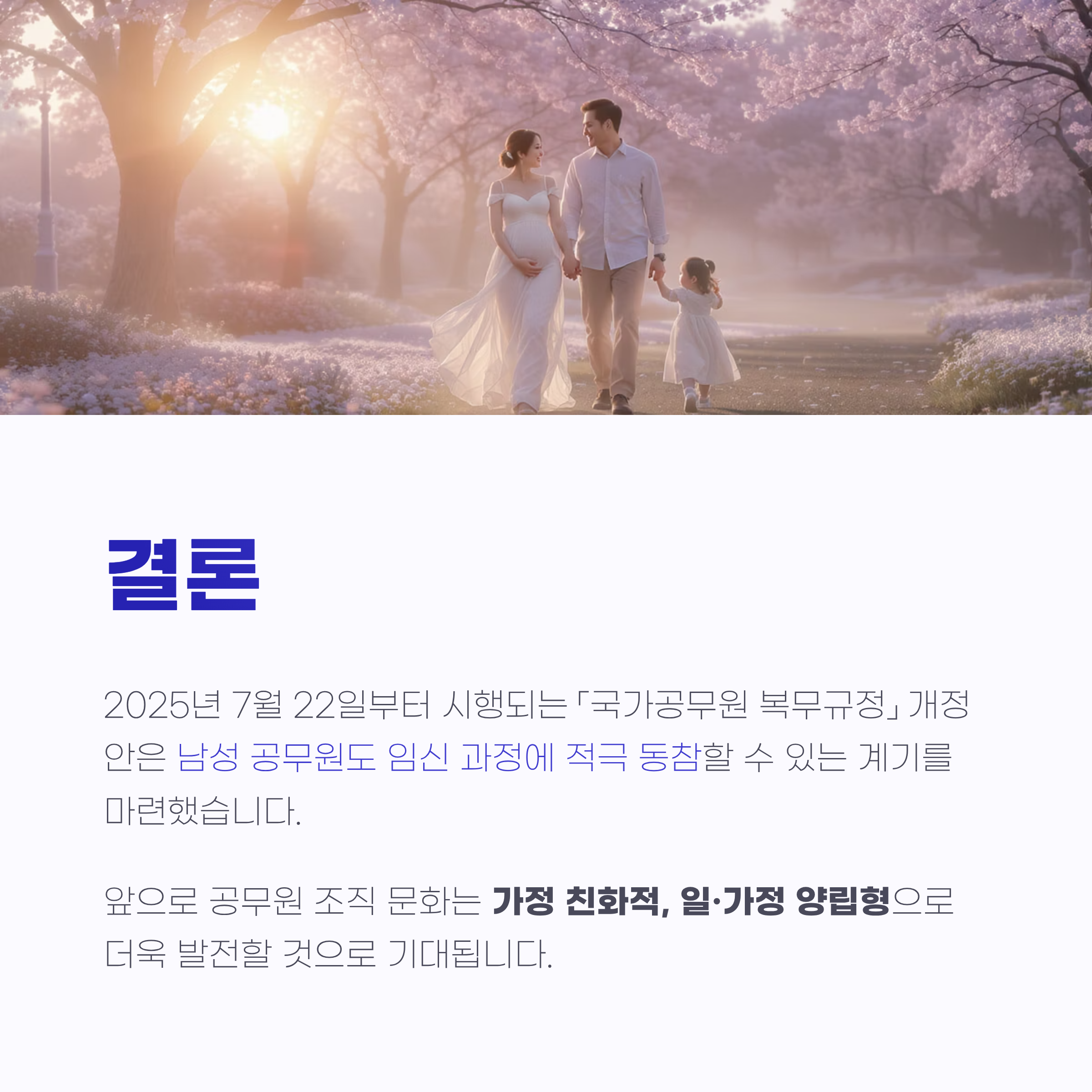 2025년 7월 22일부터 시행되는 「국가공무원 복무규정」 개정안은 남성 공무원도 임신 과정에 적극 동참할 수 있는 계기를 마련했습니다.