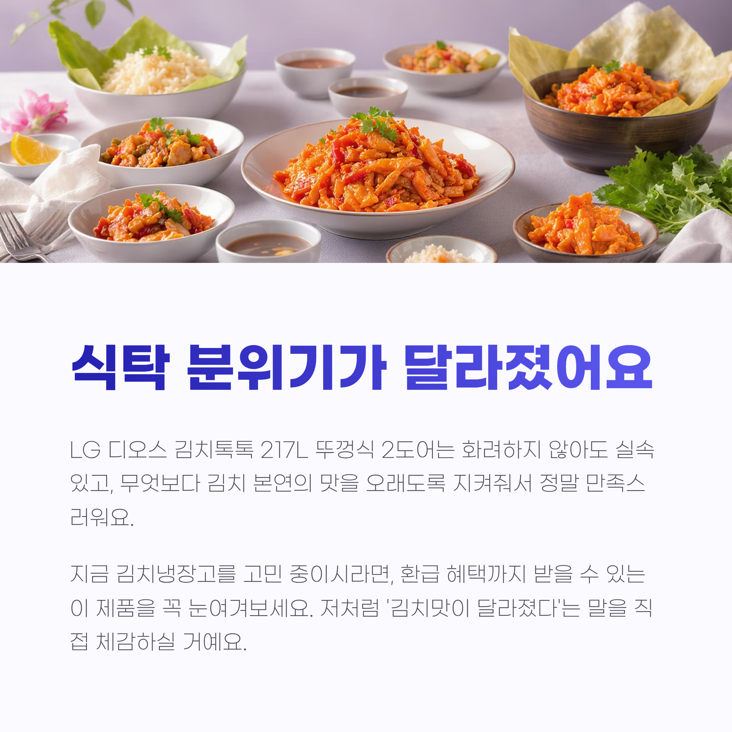 김치냉장고를 바꾸고 나서 식탁 분위기부터 달라졌어요. LG 디오스 김치톡톡 217L 뚜껑식 2도어는 화려하지 않아도 실속 있고, 무엇보다 김치 본연의 맛을 오래도록 지켜줘서 정말 만족스러워요.