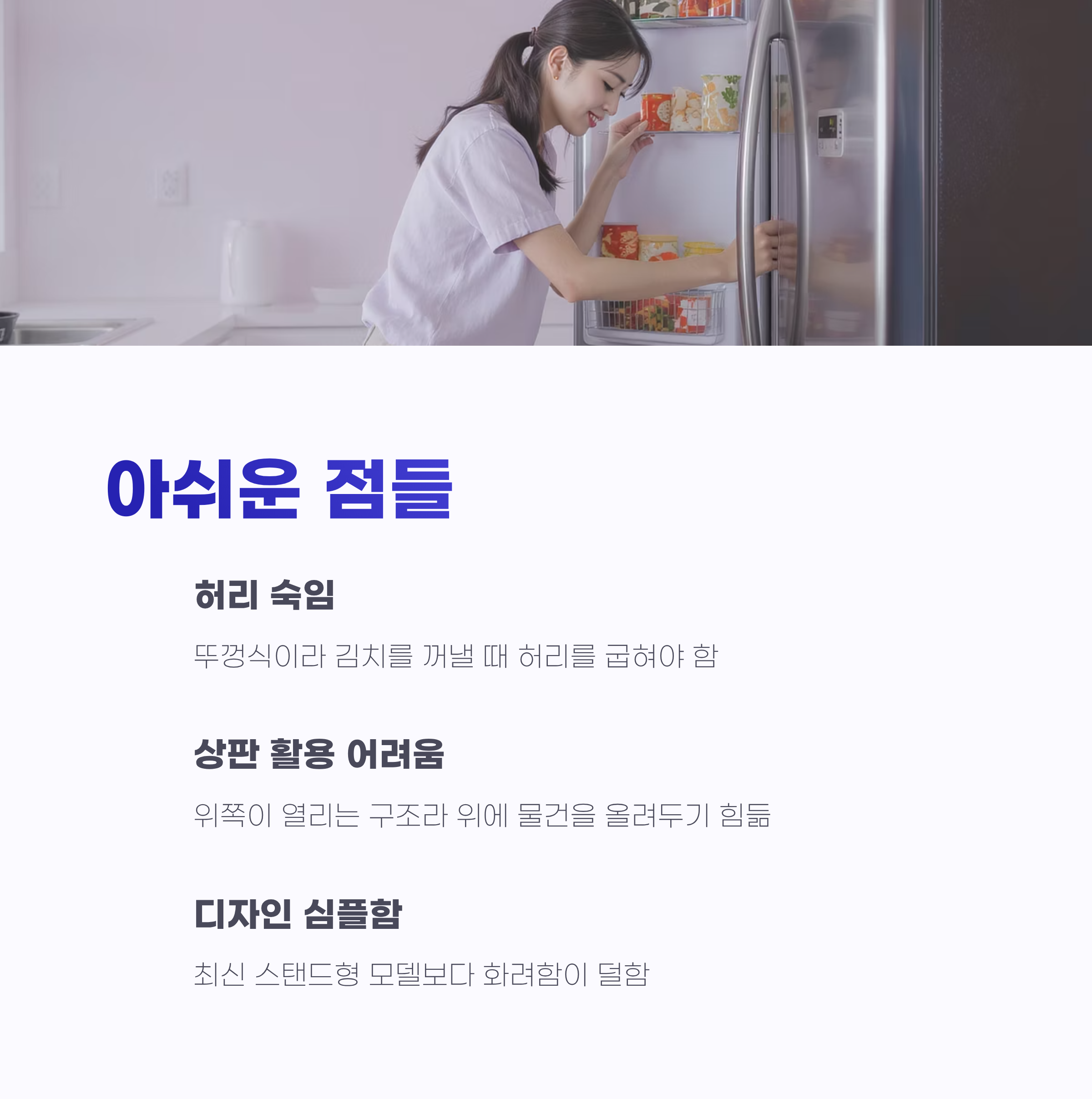 솔직히 모든 제품이 완벽할 순 없더라고요. 가장 먼저 느낀 건 허리를 숙여야 한다는 점이에요. 뚜껑식은 꺼낼 때 허리를 굽혀야 해서, 양이 많을 때는 조금 불편했어요. 특히 김치통이 무거울 때는 살짝 번거로웠답니다.