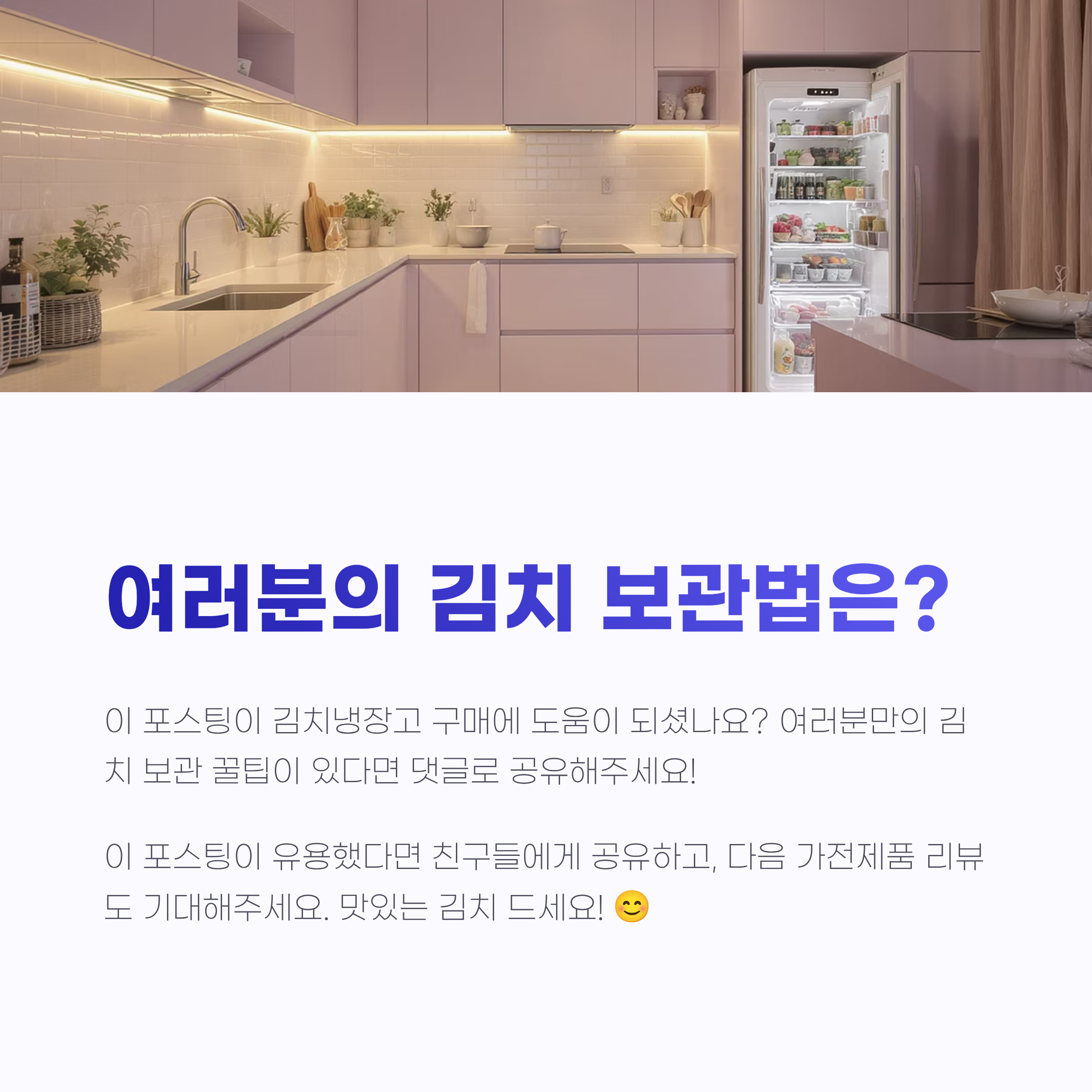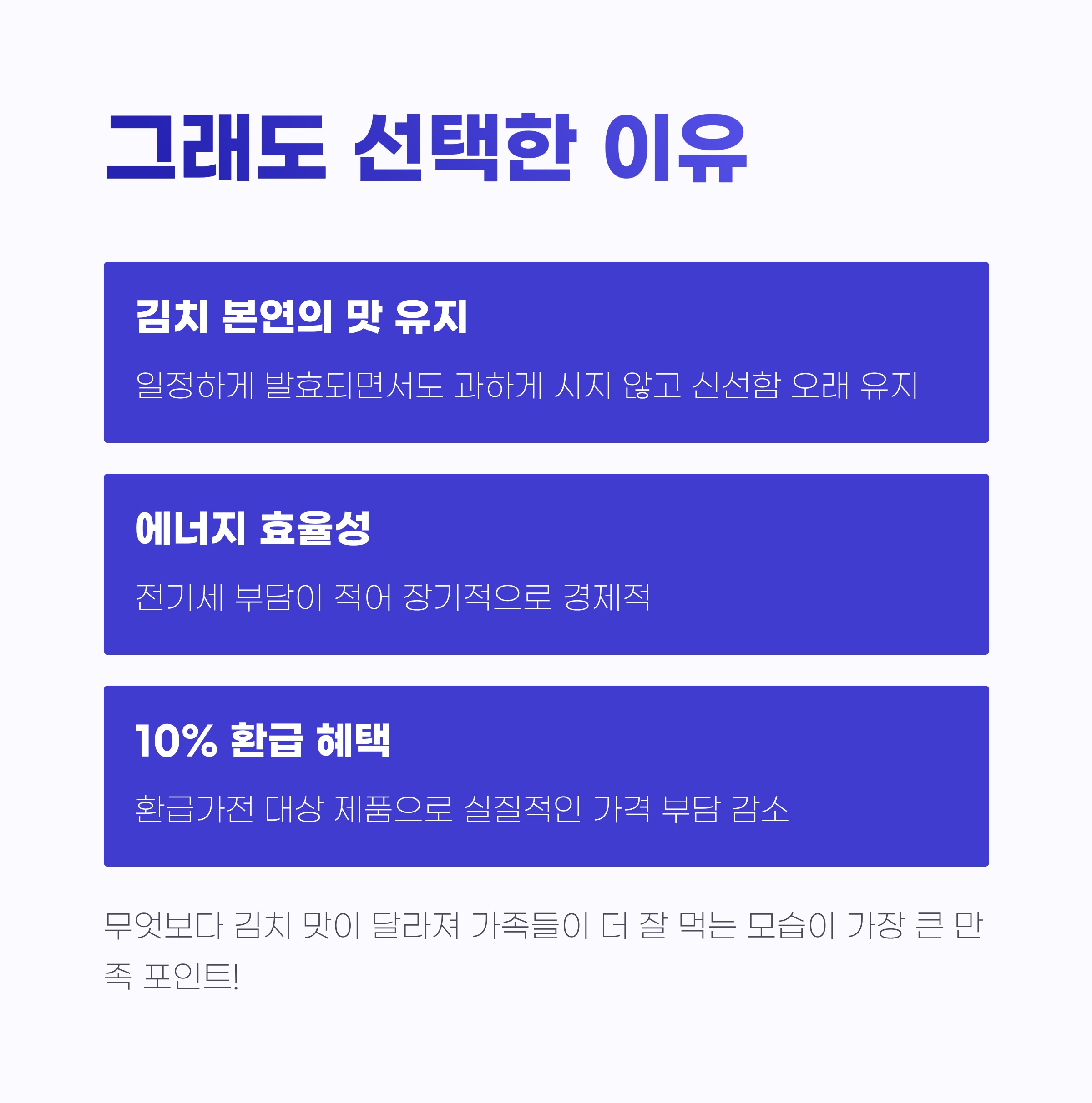 무엇보다 김치냉장고 하나로 식탁 위 김치 맛이 달라지니까 가족들이 더 잘 먹고, 밥상이 풍성해진 게 너무 기분 좋았어요. 저는 이게 가장 큰 만족 포인트였어요.