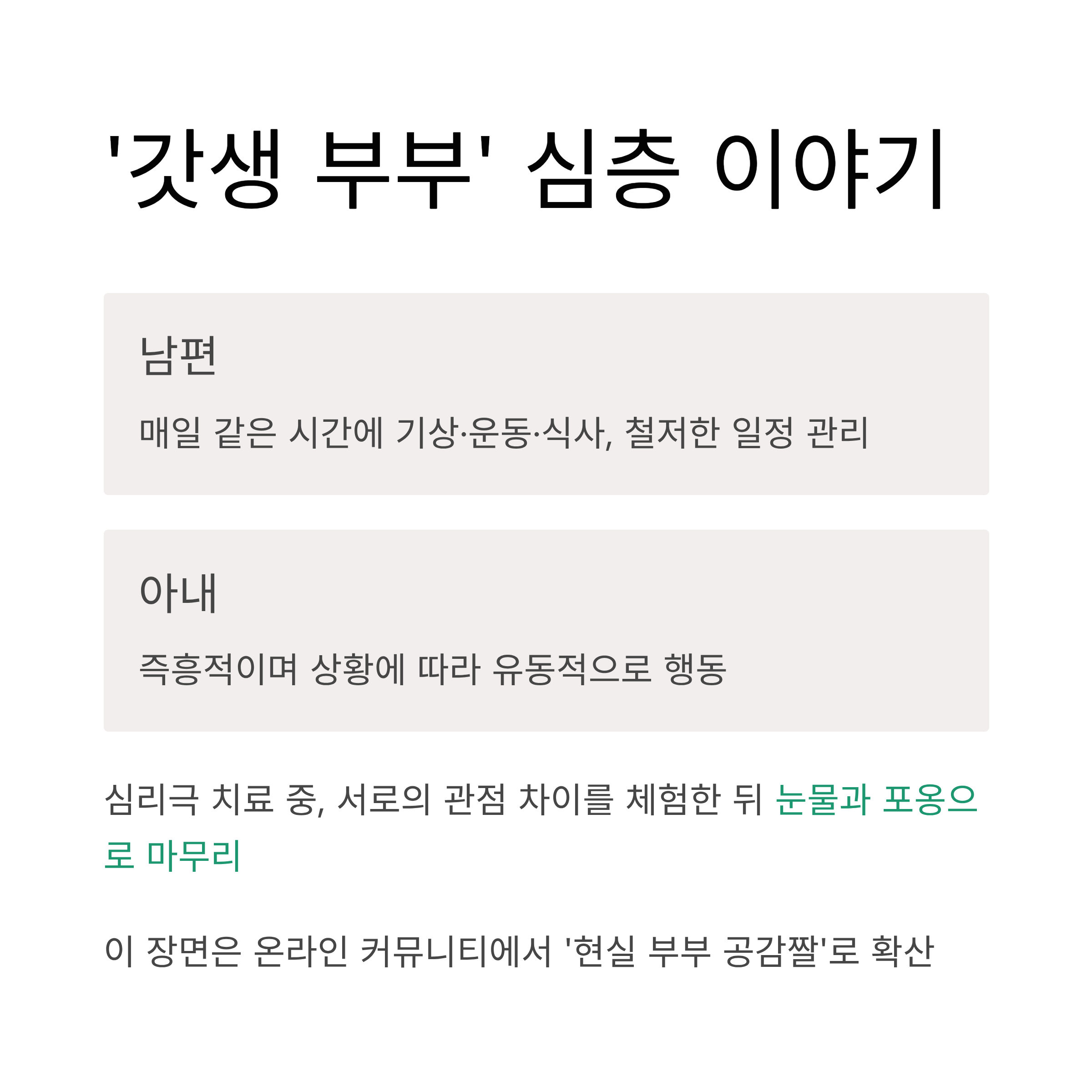 - 해결 실마리: 부부가 변화하는 과정을 지켜보는 감동