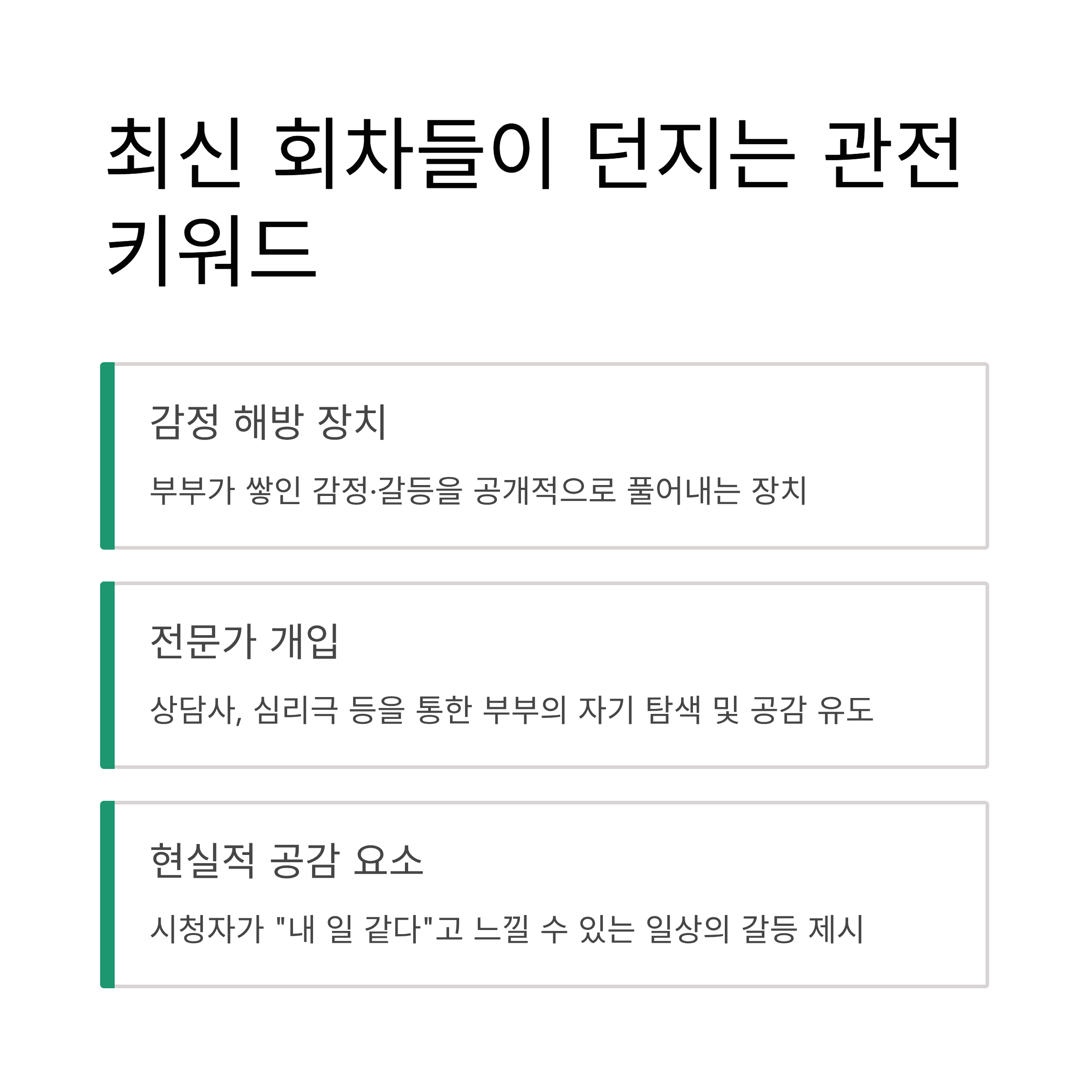 | 현실적 공감 요소 | 시청자가 “내 일 같다”고 느낄 수 있는 일상의 갈등 제시 |