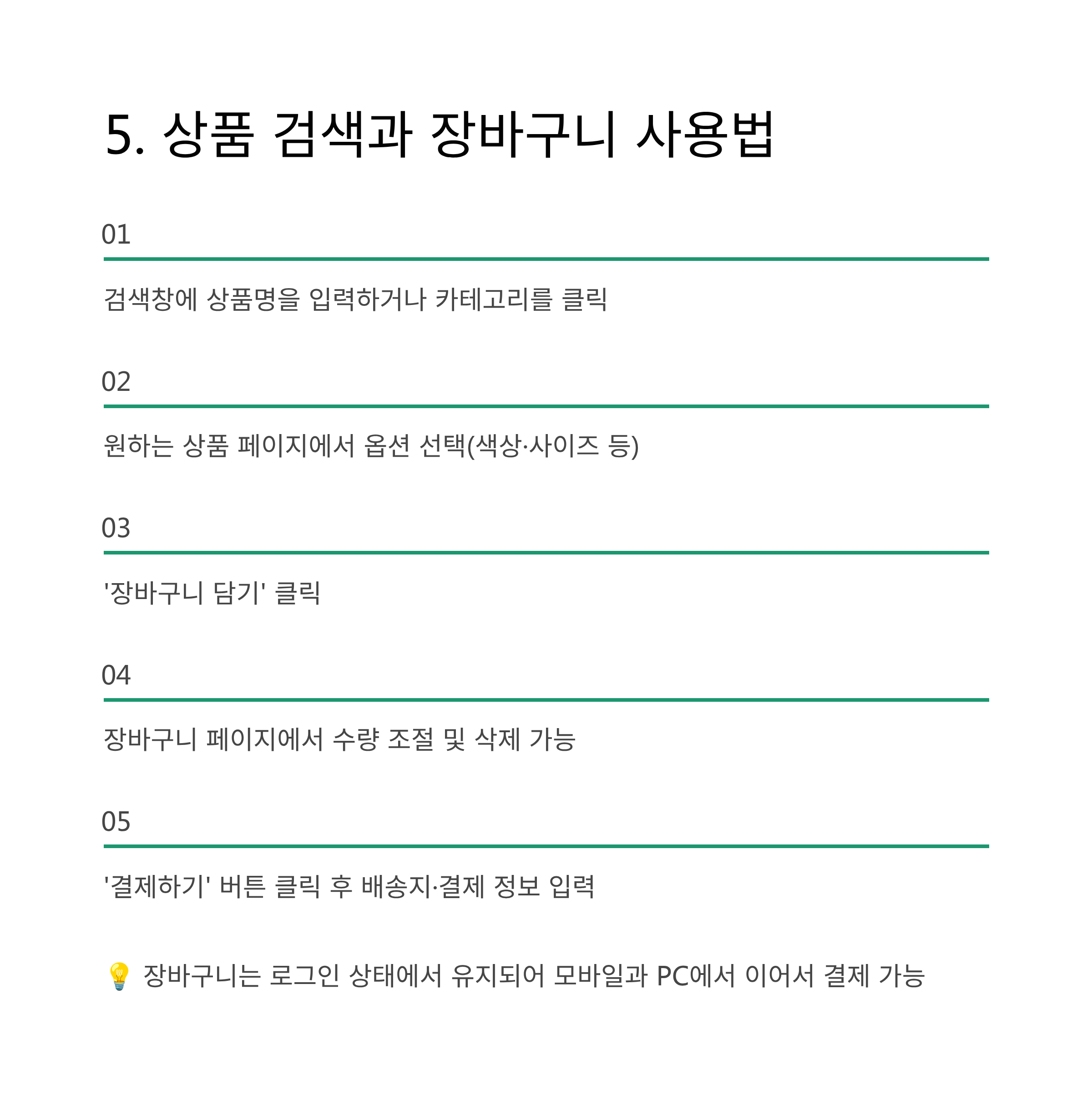 💡 장바구니는 로그인 상태에서 유지되므로, 모바일과 PC에서 이어서 결제할 수 있습니다.