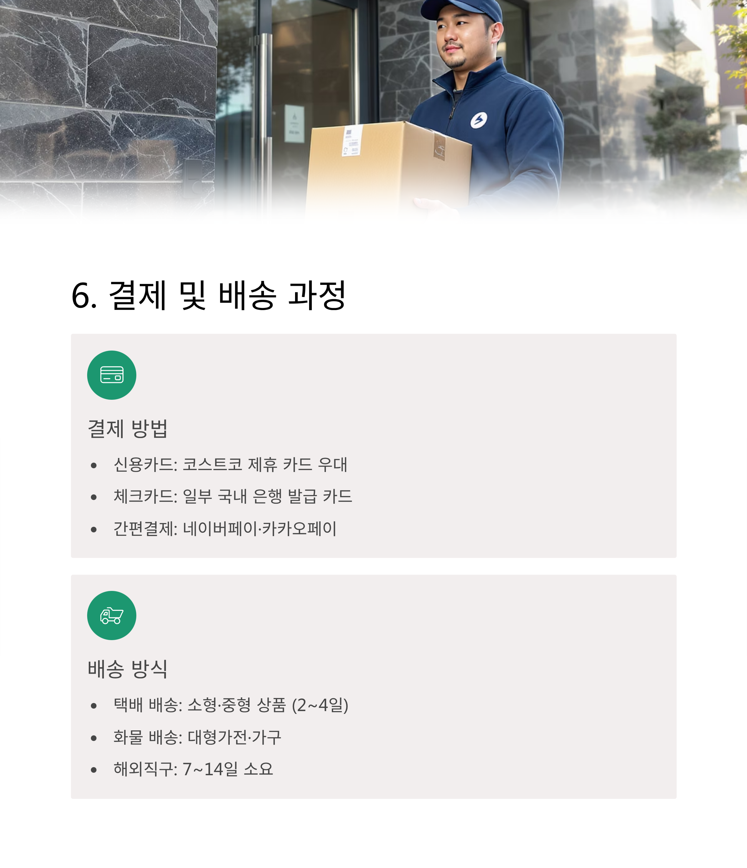 - 택배 배송: 소형·중형 상품 (평균 2~4일 소요)
