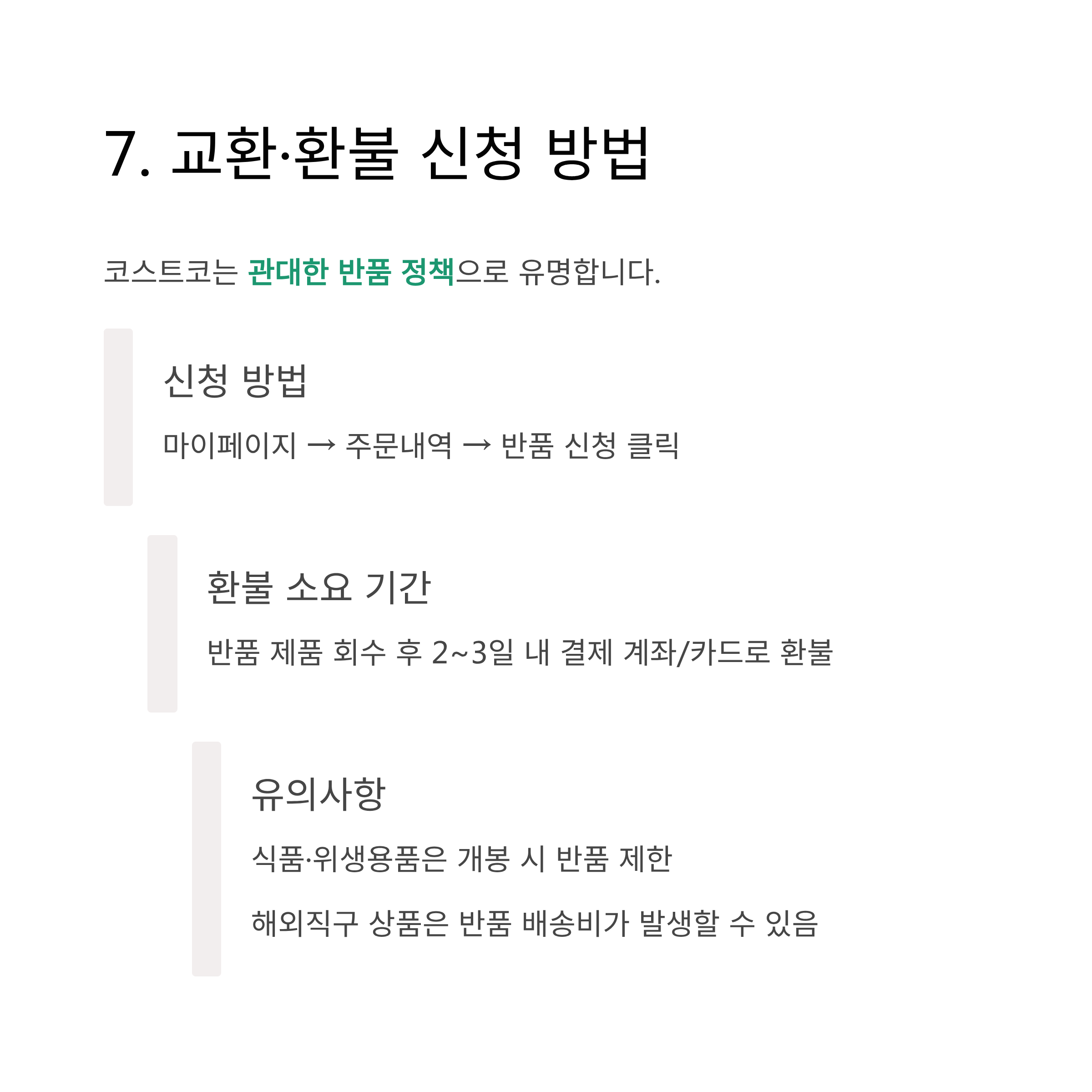 - 교환·환불 규정: 제품 수령 후 일정 기간 내 가능, 단 식품은 개봉 시 제한